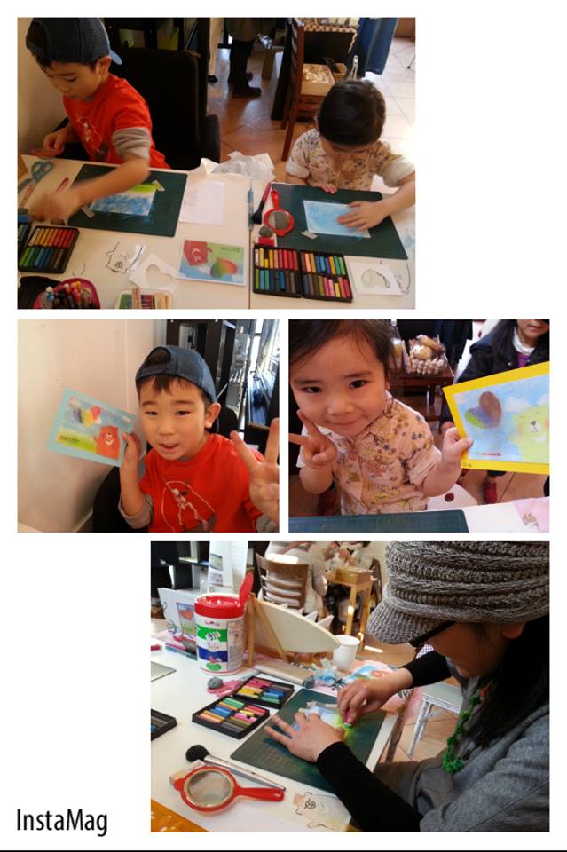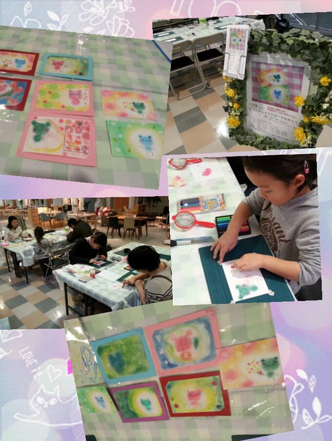 女の子はピンク色のカエルをお母さまと一緒に描き上げ